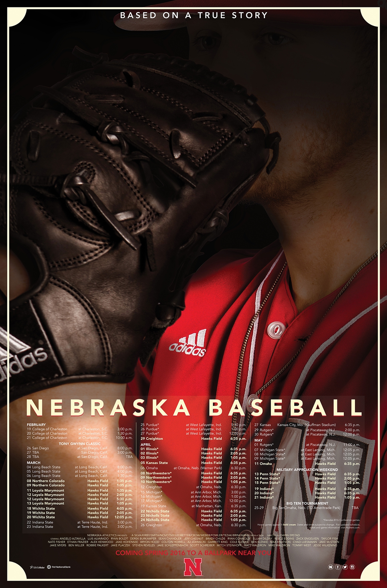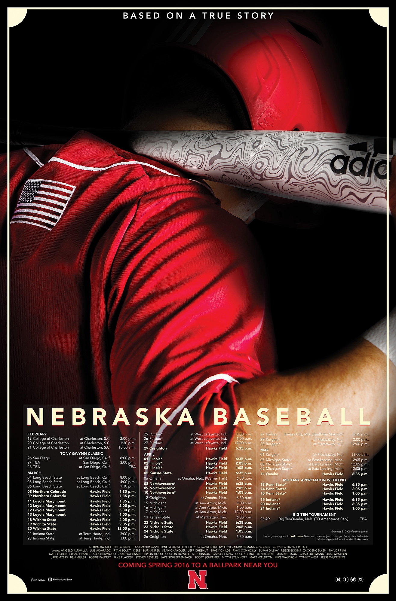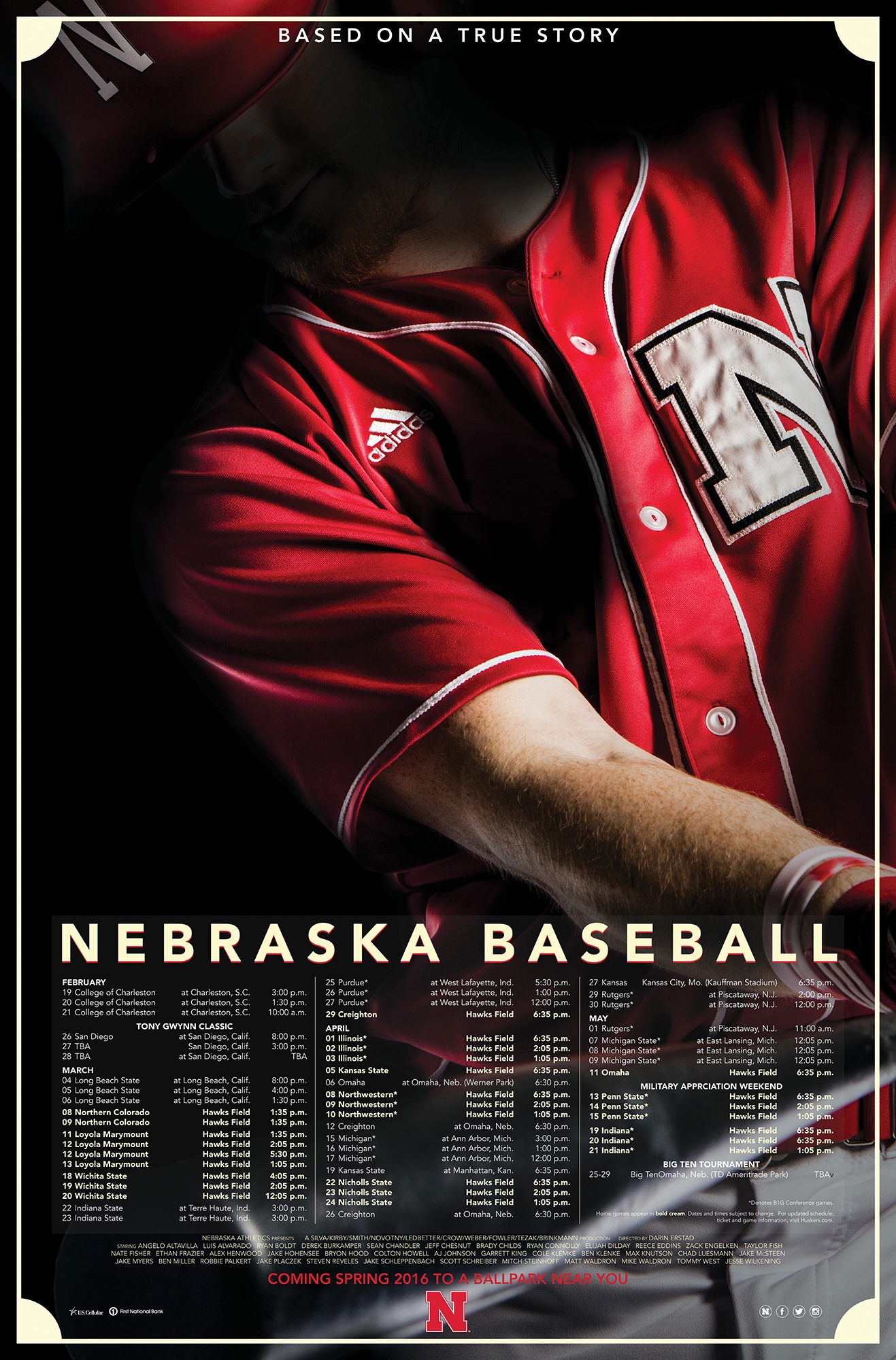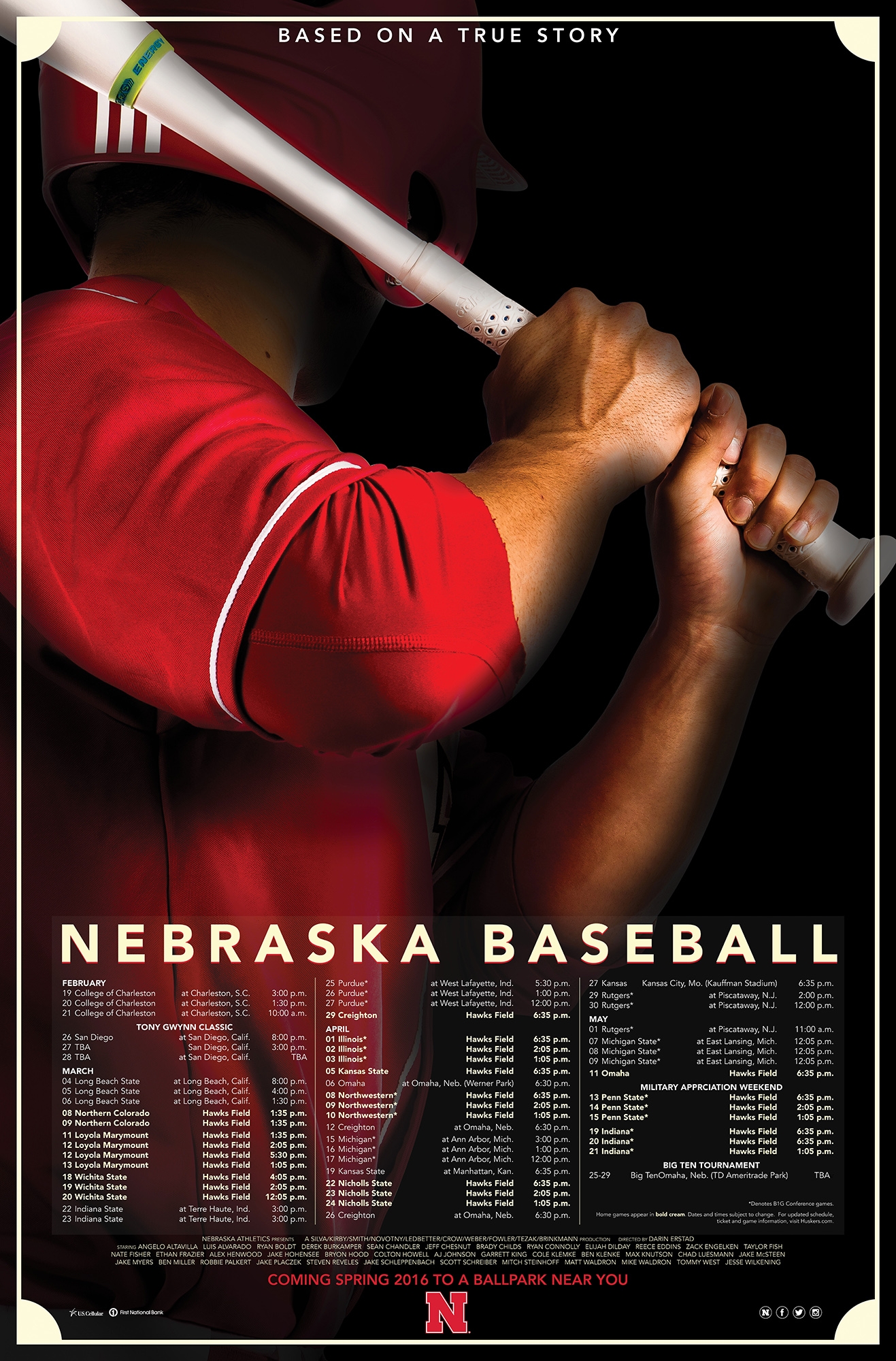 The initial concept was to present the 2016 Nebraska Baseball schedule poster as a feature film.  Five posters were developed, each one featuring one of the five seniors on the team.  The poster was sized to a traditional film poster, 27″ x 40″ and included the cast of characters listed below the schedule.  Listed below are some low res renderings of the posters.